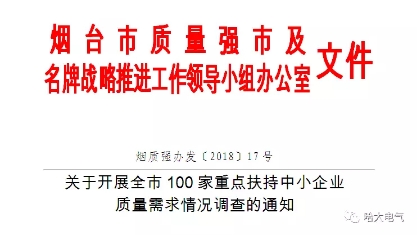2018年4月27日,山東哈大電氣有限公司收到了來(lái)自“煙臺(tái)市質(zhì)量強(qiáng)市及**戰(zhàn)略推進(jìn)工作領(lǐng)導(dǎo)小組辦公室”發(fā)來(lái)的紅頭文件,哈大電氣正式入選煙臺(tái)市“質(zhì)量強(qiáng)市”100家重點(diǎn)扶持企業(yè)。全開(kāi)發(fā)區(qū)只有10家企業(yè)入選,哈大電氣為其中之一。
